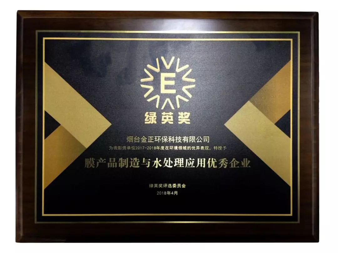 煙臺(tái)金正環(huán)保科技有限公司于2018年4月20日,榮獲2017-2018年度“綠英獎(jiǎng)-膜產(chǎn)品制造與水處理應(yīng)用優(yōu)秀企業(yè)榮譽(yù)”稱(chēng)號(hào)。