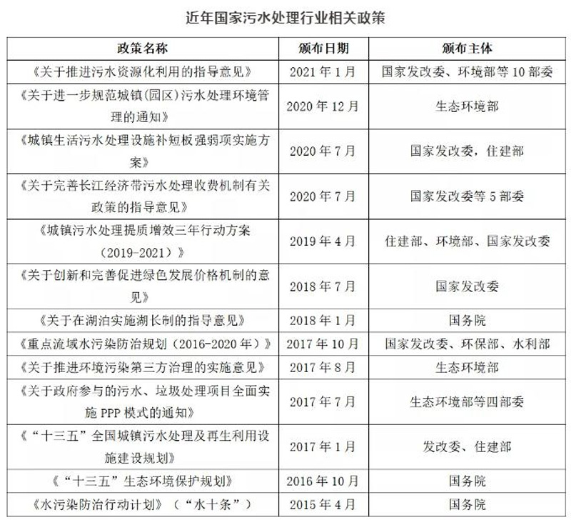 隨著我國經(jīng)濟(jì)不斷發(fā)展,生態(tài)問題日漸凸顯,政府對環(huán)保問題日趨重視,近年來,國家出臺多項污水處理相關(guān)政策,涉及水污染防治、污水處理市場化機制等多方面內(nèi)容,推動我國污水處理市場不斷規(guī)范化發(fā)展。