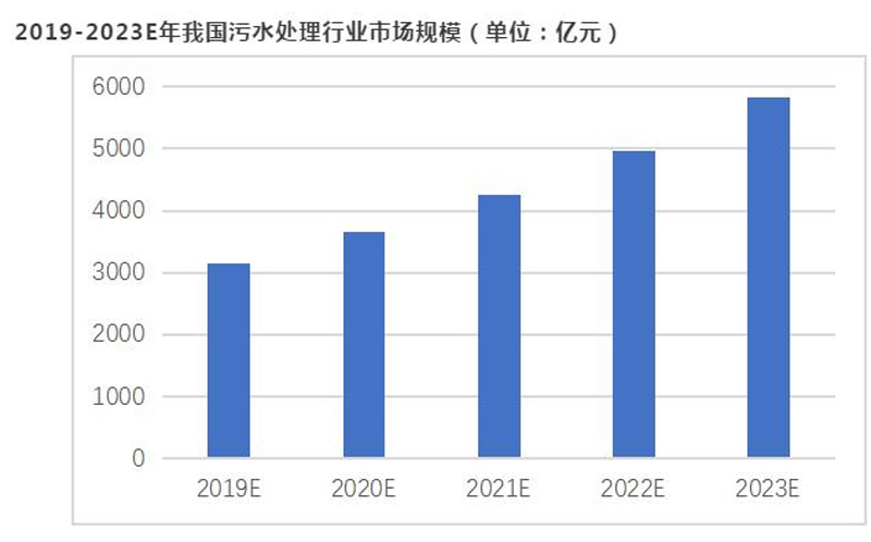 受國家政策支持、各方資本涌入、技術(shù)工藝革新等因素驅(qū)動,我國污水處理行業(yè)將持續(xù)快速發(fā)展,預(yù)計到2023年,我國污水處理行業(yè)市場規(guī)模將達(dá)到5820億元,2019-2023年復(fù)合增長率達(dá)14.7%。