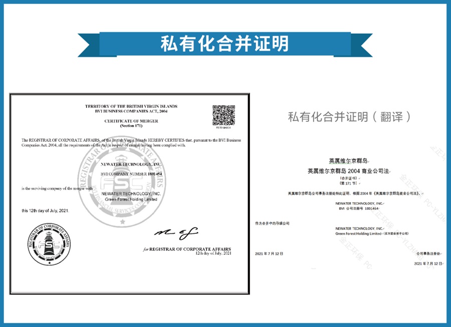 2021年7月12日,買方團(tuán)于BVI政府監(jiān)管部門完成對(duì) NEWATER TECHNOLOGY, INC.的合并備案。