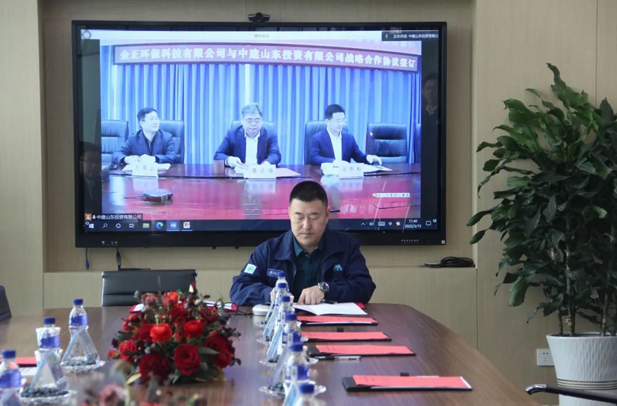 3月15日上午,煙臺(tái)金正環(huán)??萍加邢薰荆ㄒ韵潞?jiǎn)稱金正環(huán)保)與中建山東投資有限公司(以下簡(jiǎn)稱中建山東)在金正環(huán)保產(chǎn)業(yè)園簽訂戰(zhàn)略合作框架協(xié)議。為落實(shí)疫情防控工作要求,此次簽約采取“線上+線下”的方式進(jìn)行,金正環(huán)保為主會(huì)場(chǎng),中建山東董事長(zhǎng)裴正強(qiáng)、總經(jīng)理王有標(biāo)等領(lǐng)導(dǎo)線上連線進(jìn)行,中建山東副總經(jīng)理嚴(yán)強(qiáng)、金正環(huán)保總經(jīng)理李越彪等領(lǐng)導(dǎo)現(xiàn)場(chǎng)出席簽約儀式。