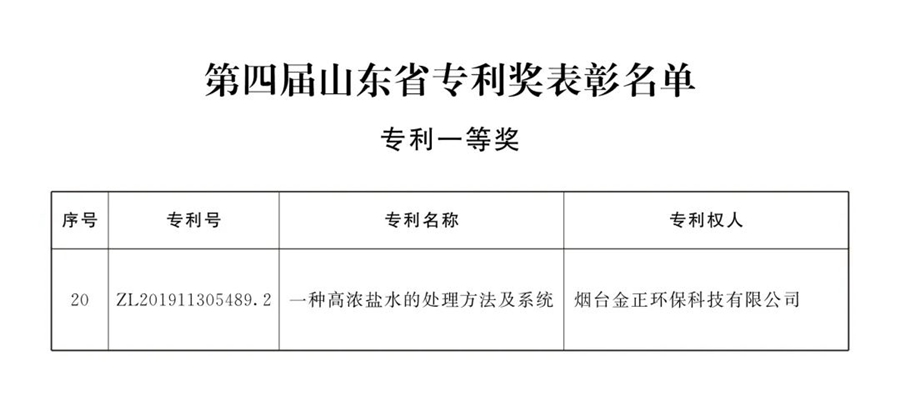 日前,《山東省人民政府關(guān)于第四屆山東省專(zhuān)利獎(jiǎng)勵(lì)的通報(bào)》正式公布,由煙臺(tái)金正環(huán)保自主研發(fā)的“一種高濃鹽水的處理方法及系統(tǒng)”(中國(guó)發(fā)明專(zhuān)利:ZL201911305489.2),榮獲“第四屆山東省專(zhuān)利獎(jiǎng)一等獎(jiǎng)”。
